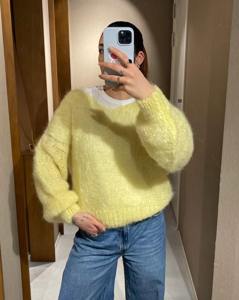 ~ ikonický mohérový svetr navržený v Kodani s oversized střihem a výstřihem do V